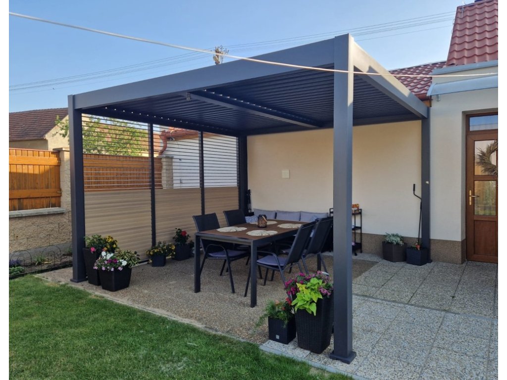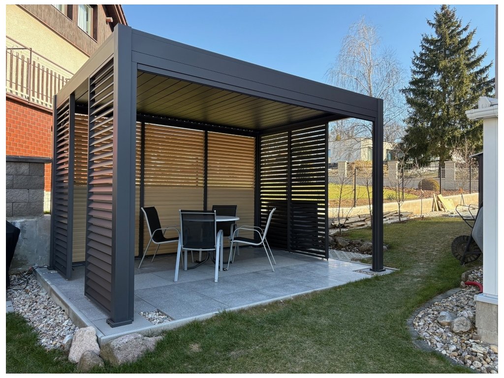Pro maximální využití bioklimatických pergol nabízíme také příslušenství v podobě panelu s horizontálními sklápěcími lamelami pro zastínění bioklimatické pergoly a získání většího soukromí. Velmi pevná a stabilní konstrukce v antracitové barvě RAL 7016. Panel a lamely jsou vyrobeny z vysoce kvalitního hliníku, který je ošetřen práškovou barvou, což zaručuje odolnost vůči povětrnostním vlivům. Lamely jsou potažené laminátovou fólií v dekoru dřeva. Fólie slouží jako dekorativní povrchová úprava. Je na hliníkový podklad aplikována za pomoci tepla a tlaku, díky čemuž pevně přilne a vznikne pevná a stabilní struktura. Panel lamel je rozdělen na dvě části, můžete tak sklápět zvlášť horní a spodní část lamel. Lamely je možné mít ve svislé pozici, nebo je natočit maximálně o 120°.