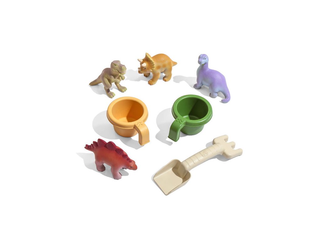 - součástí balení je 7 dílná sada: oboustranná lopatka s hrabičkami, 4 pravěká zvířata, 2 kalíšky