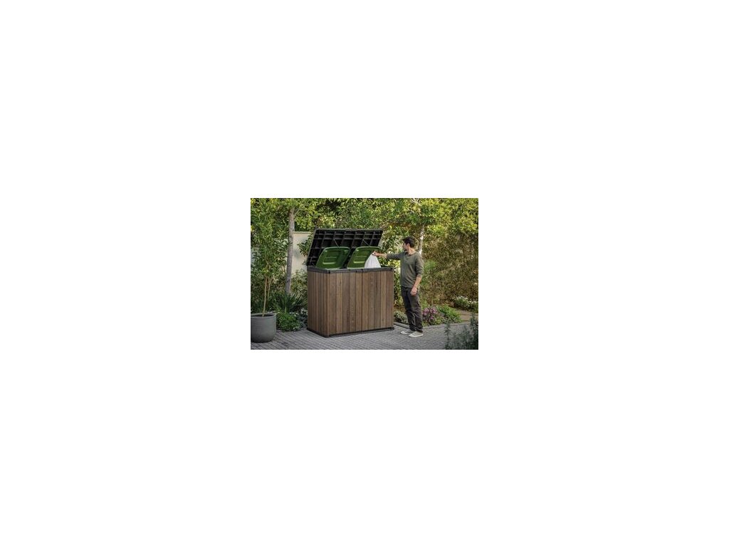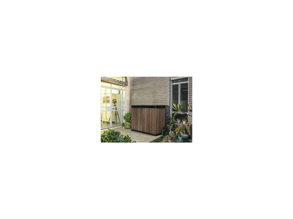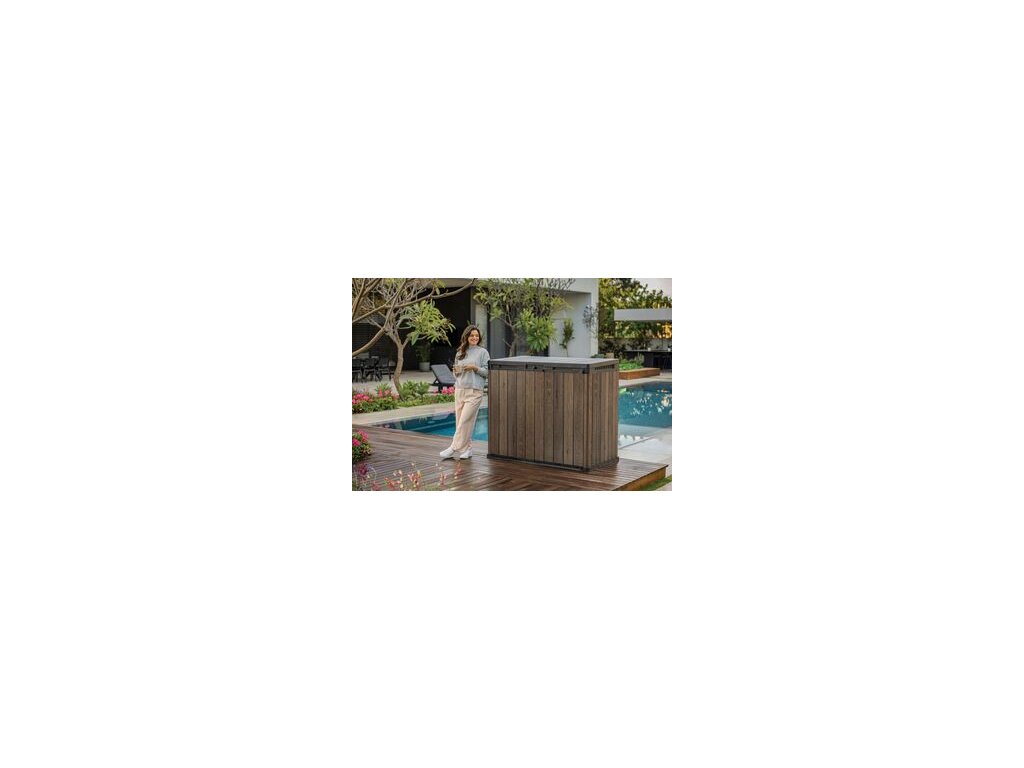 Designová, plastová skříň z řady DECO HORIZONTAL STORE IT OUT v provedení WALNUT disponuje úložným prostorem o objemu 1 150 L. Skříňka umožňuje pohodlně uložit vše, co chcete mít po ruce na Vaší zahradě. Ideální pro uschování zahradního nářadí, zahradních doplňků nebo sportovního vybavení. Je možné do ní také uschovat popelnice. Otevírací střecha a dvojité dveře umožňují snadný přístup do interiéru pro pohodlné ukládání a snadné vkládání a vyjímání předmětů. Skříňka se vyznačuje jednoduchým a elegantním designem a také strukturou povrchu připomínající dřevo. Kvalitní kompozitní materiál EVOTECH i na dotek připomíná dřevo, ale je pevnější než samotné dřevo. Vysoce kvalitní plastové materiály zajišťují životnost výrobku po mnoho let.